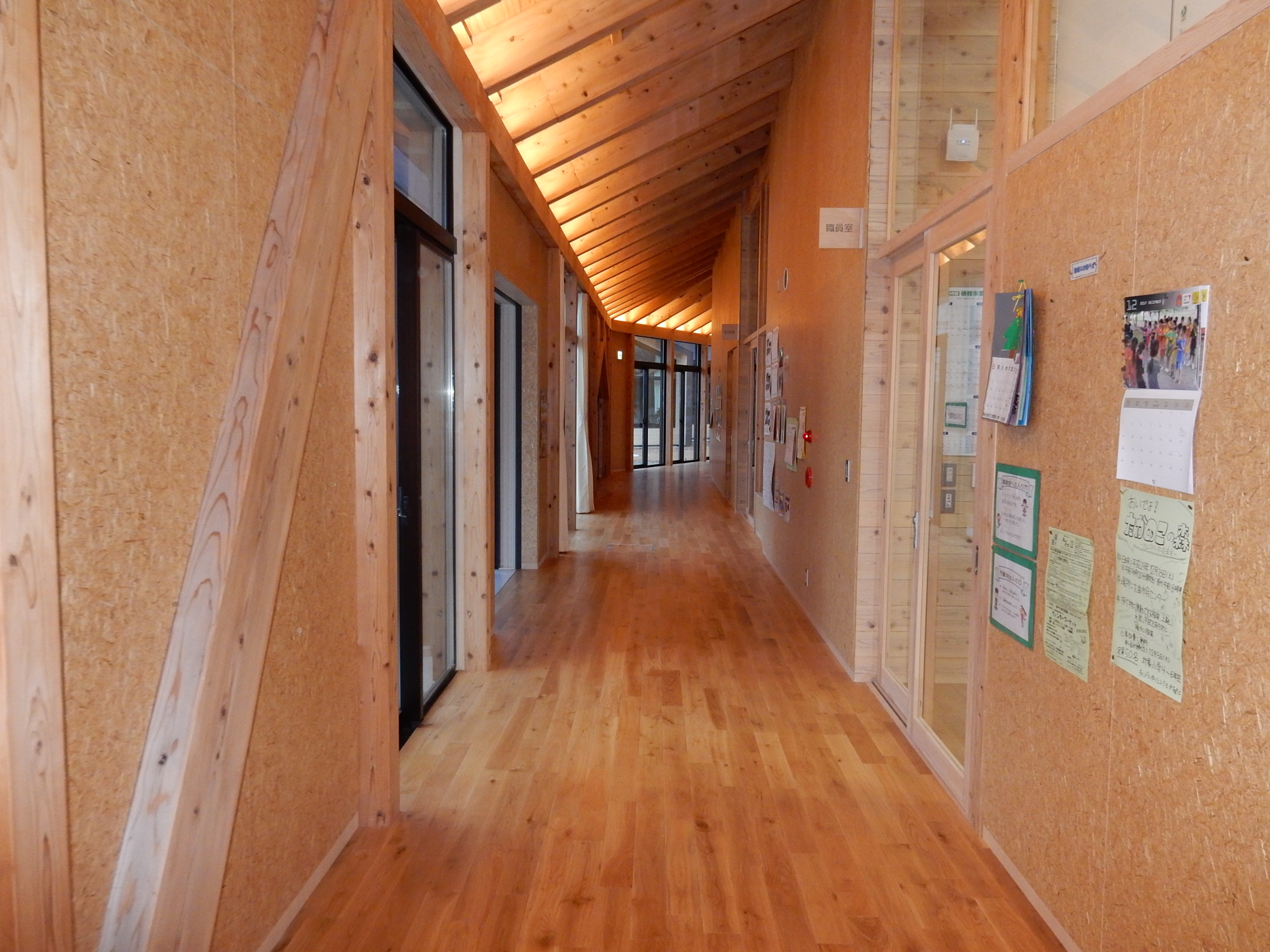 木材がふんだんに使用されている廊下にまず驚かされる 普通は覆い隠す壁面素地をあえて見せる構造に