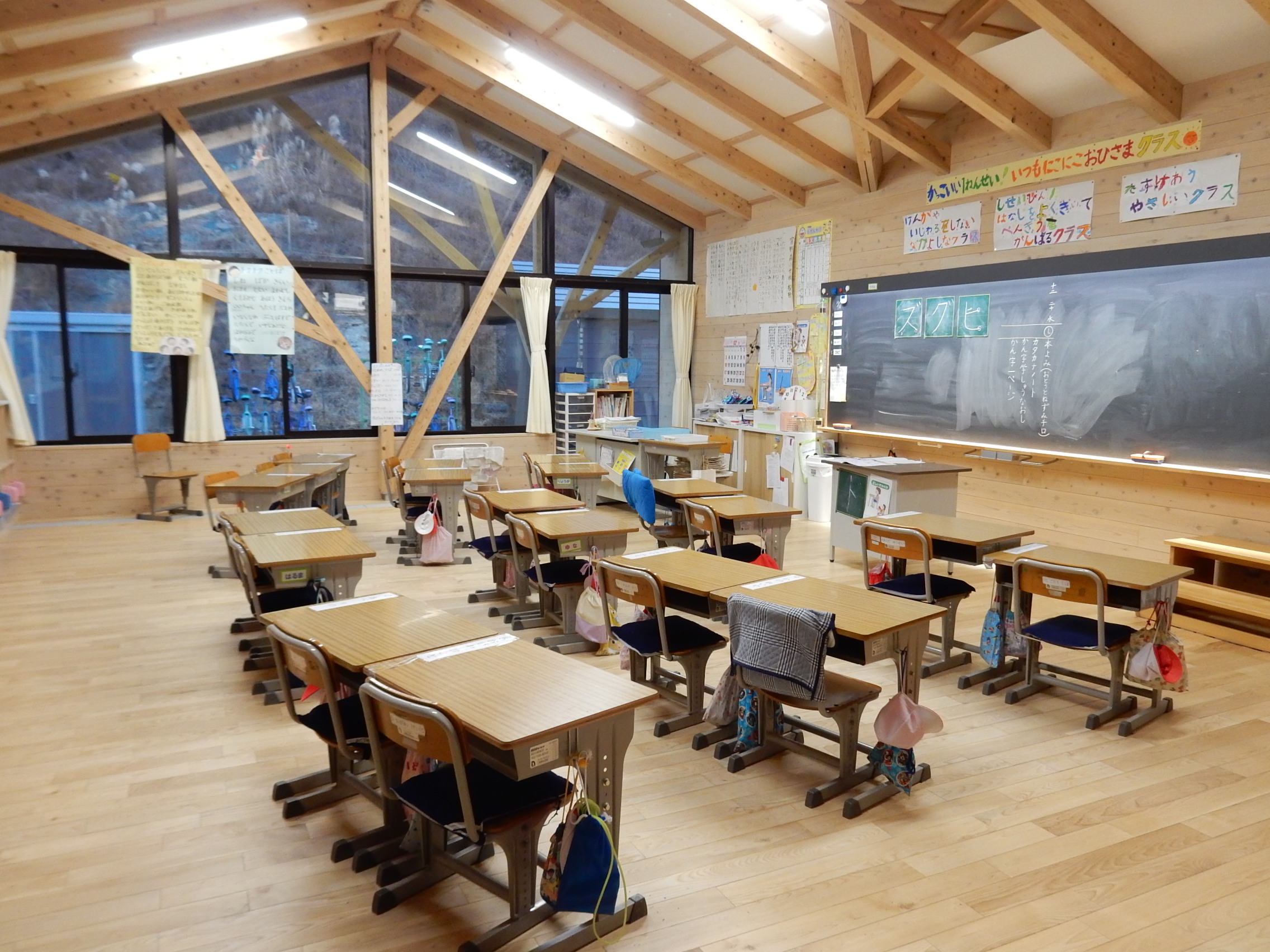 1学年1教室 約20名の配置 黒板には照明が設置