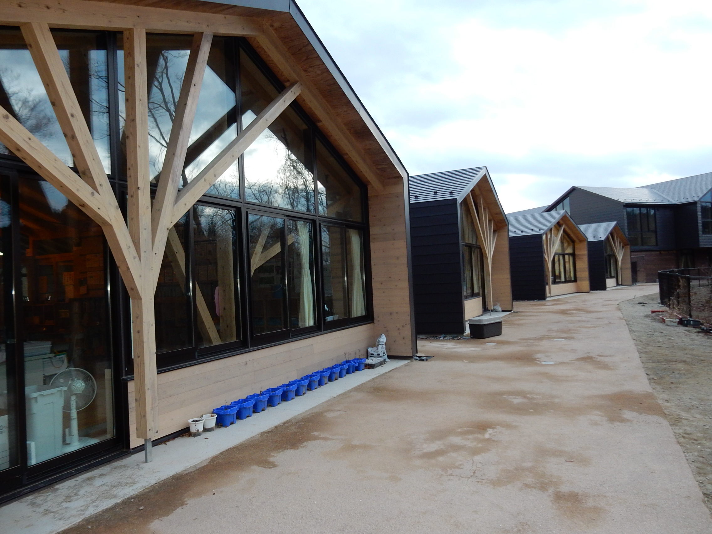 屋外から見た教室は、それぞれが独立したユニットになっている 支柱は樹木の枝の形状にセット