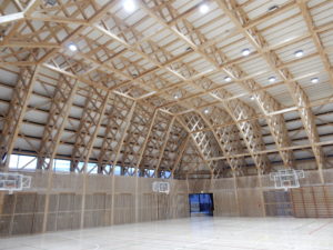 体育館  木造トラス工法 拾い木造空間に包まれる
