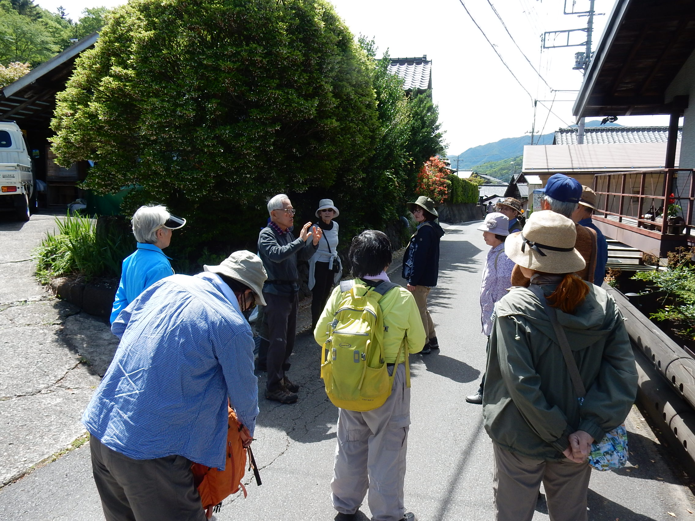六合村(くにむら)赤岩地区の説明をするE氏に聞き入る参加者 赤岩集落は江戸・明治からの家並みを今に残し、重要伝統的建造物保存地区に指定されている 2019.5.22