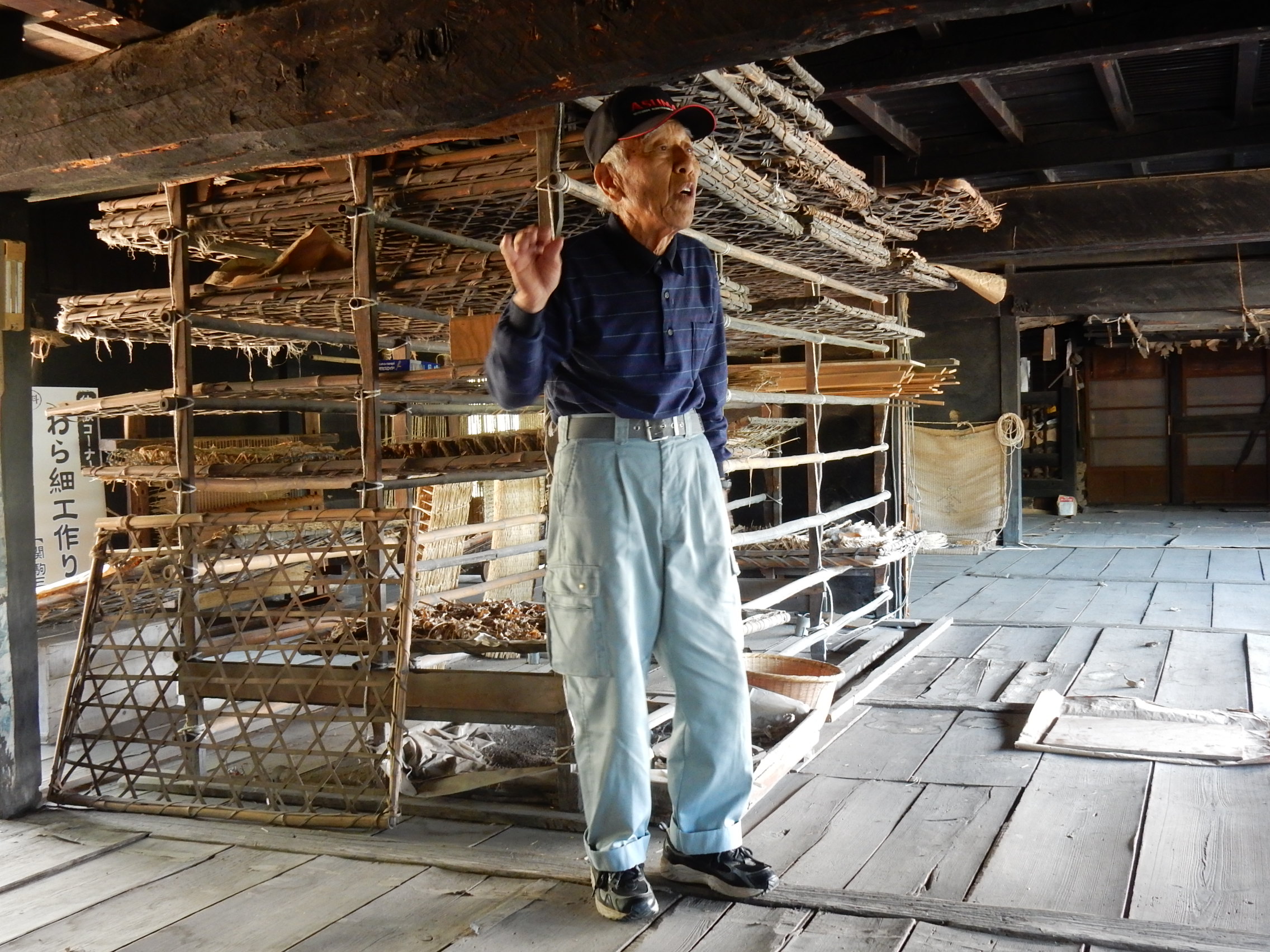 関 駒三郎さん 赤岩地区では明治時代以前から養蚕が営まれており、養蚕に適した3(4)階屋の家屋が残されている 関さんからは養蚕事業の仕組みや、わら細工の説明を楽しく受ける