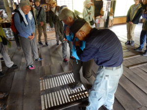 3階の床板が通風機能を持たせる為に外された状態   強度がある松材での格子が入っているが、オッカナビックリ渡る会員