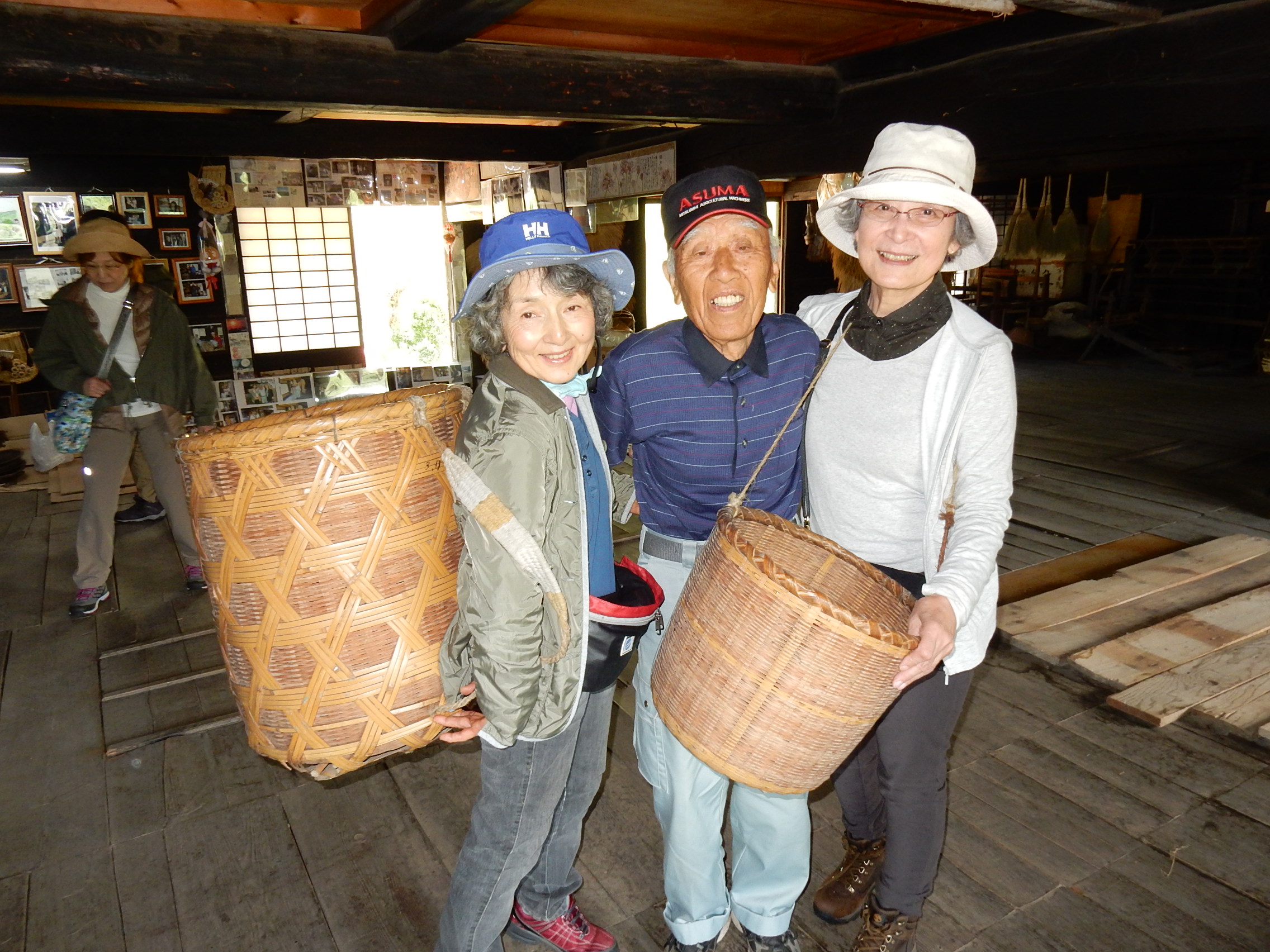 群馬県の草津温泉近くをショートカットして、国道292号白砂渓谷ラインを北上する。間もなく六合(くに)赤岩地区に到着する。かつて養蚕業が盛んな地区で、養蚕農家などの古い建物が重要伝統的建造物群保存地区に指定されている。会員E氏の解説で赤岩地区の概要を学んだ後で、ボランティアガイドをやっている関 駒三郎さんの自宅での養蚕業の歴史や、わら細工作りの話を聞かせてもらったが、織物をやる会員との掛け合い談義では時間を経つのが忘れそうになるほどの熱の入ったものだった。
