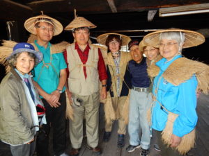 わら細工の蓑笠を着て、ちょっとハイテンションなメンバー