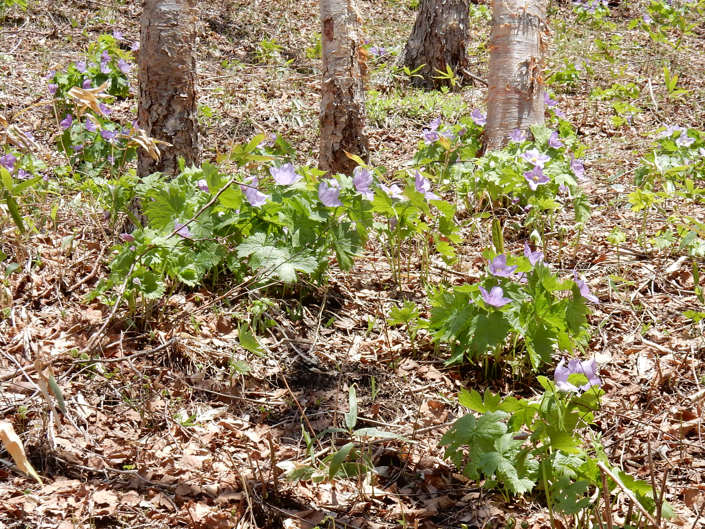 お腹が膨れたところでの山歩きはちょっときついが残りの時間は迫っている。標高差は50m程度であろうか、シラネアオイの群生地目指しての登山?を開始する。歩道に沿って矮性化したショウジョウバカマが咲いているが、山頂側から降りてくる登山客は「上には何もないよ、風が強いだけ!」と投げやりな言葉が耳に入る。よっぽど期待はずれの山頂であったのだろう。しかし我らの目的地は山頂にあらず、途中から左に折れた森林方向だ。大きなカメラを担いだ男性と、「シラネアオイは如何でしたか?」「今年は少し寂しい感じだね・・・」のやり取り。