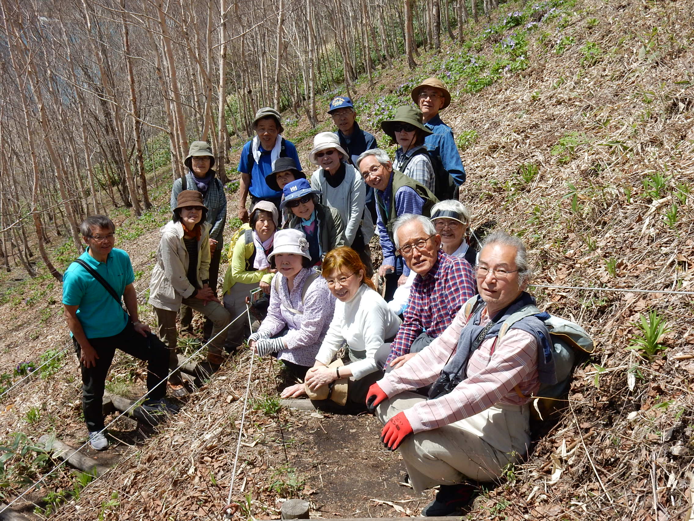 急な斜面で一息つくメンバー 後ろにシラネアオイの群落が見える 2019.5.22
