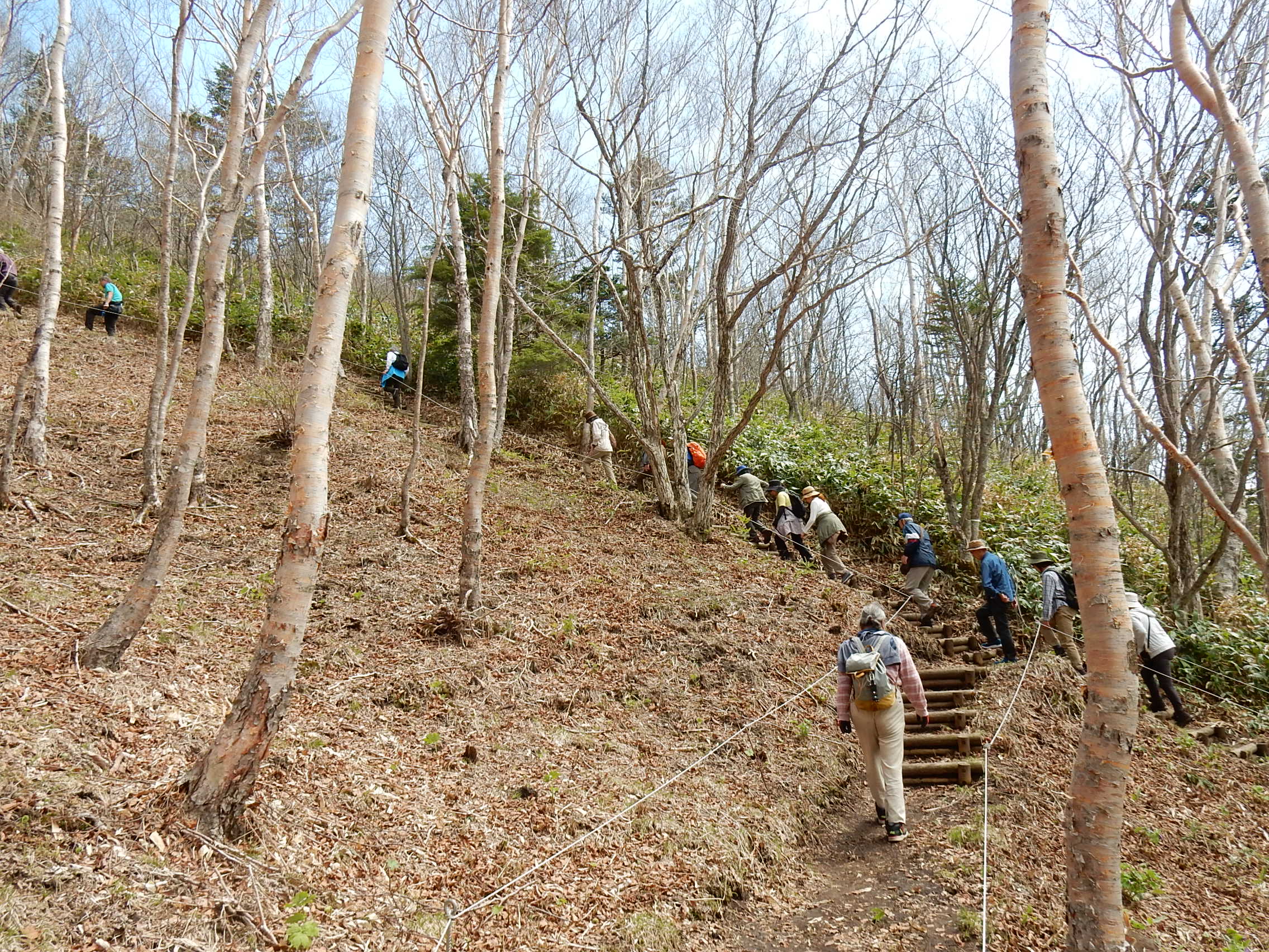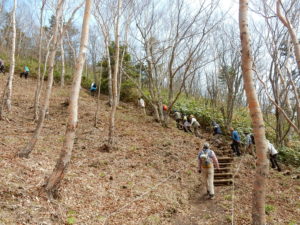 急な斜面を登るメンバー 左側のダケカンバ林と奥地のクマザサの林床植生が異なっているのが分かるが、ほっておくとササの侵入が考えられるので人工的に対策をしているのではないか?