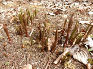 バイモ(ユリ科)2020.3.7 今年も芽を見せてくれているが、随分と株が増えてきたようだ。2013年に秋田から開花株を移植したが、その後5年間は花を見せなかった不思議な性質の植物。気候や土壌などの環境への適応力をつけた期間なのか。