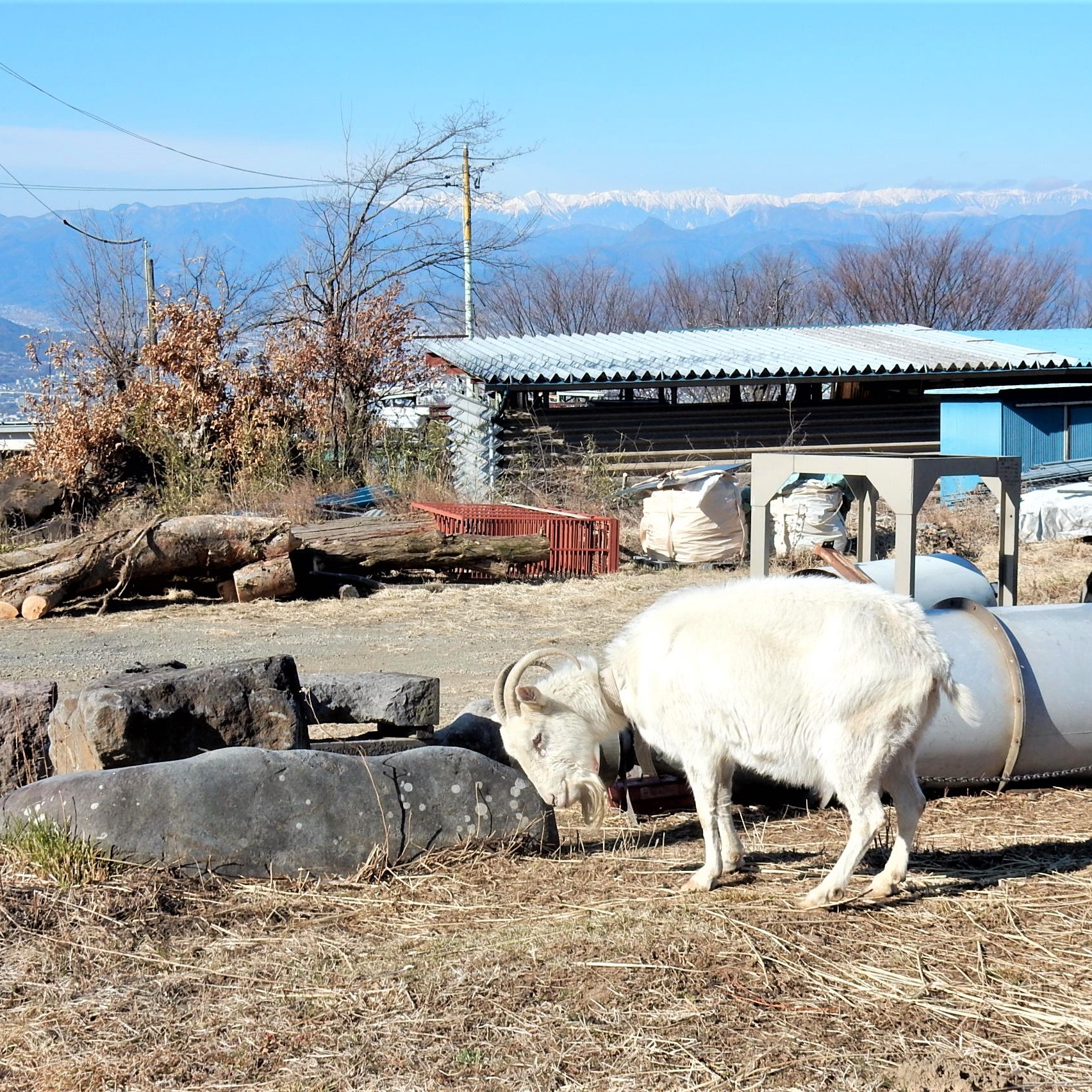 上田市郊外の北アルプスを遠望する高台にある農家では、春を待ちわびるヤギ君が笑顔を見せてくれました。「めー・・早くあおい草が食べたいねー・・」