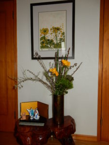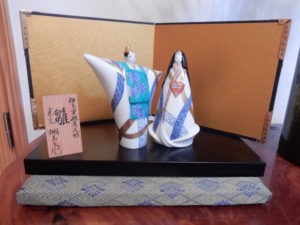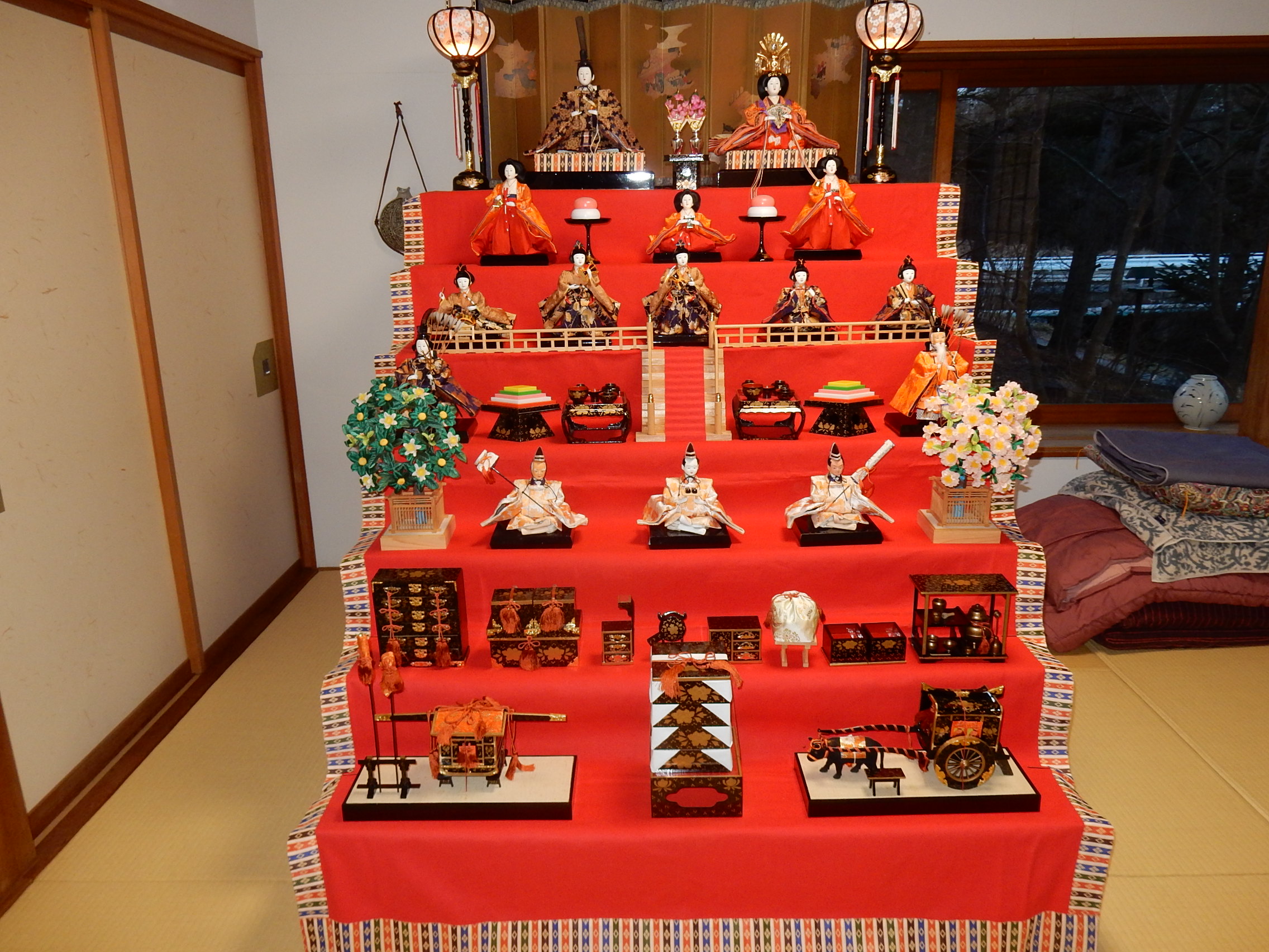 庭の福寿草の膨らみも大きくなり、咲き始めるのも目前です。寒さもどことなく緩み、午後からは雨が振り始めました。「春だなー、この雨が芽吹きの助けになるのかな」等と思えば、明日は雛節句です。我が家の娘たちが歓声を上げながら飾っていた大昔?を思い出します。先日お誘いを受けて拝見した、会員仲間の方の立派な雛飾りを皆さんにも見ていただきたくアップしました。我が家の玄関にも小さなお雛様が「こっちも忘れないで・・」とお出ましです。